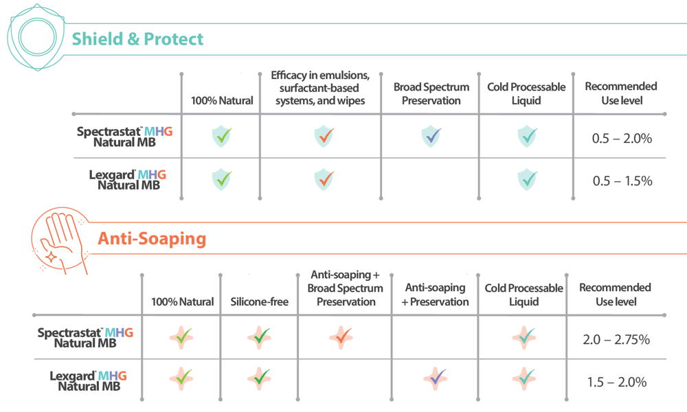 Lexgard® MHG Natural MB protects formulations from microbial growth as part of a complete preservation approach that follows the industry convention of Hurdle Technology. This convention uses multiple barriers in formulation and manufacturing to create an environment that is inhospitable to microorganisms, thus preventing their survival and proliferation.