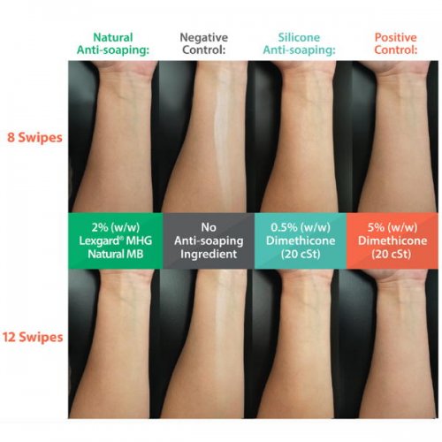 The following test articles were included in the study: emulsion with 2% (w/w) Lexgard® MHG Natural MB (natural anti-soaping); emulsion with 0.5% (w/w) dimethicone 20cSt (silicone anti-soaping); emulsion with 5% (w/w) dimethicone 20cSt (positive control); emulsion with no anti-soaping agent (negative control). The natural anti-soaping emulsion with 2% (w/w) Lexgard® MHG Natural MB showed less soaping than the silicone anti-soaping emulsion at both the 4 swipes and 8 swipes endpoints. At the 12 swipes endpoint, no soaping was observed with the natural anti-soaping lotion containing Lexgard® Natural MHG MB. This result was statistically equivalent to the positive control with 5% (w/w) dimethicone 20cSt and the silicone anti-soaping emulsion with 0.5% (w/w) dimethicone 20cSt.