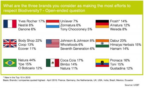 In only four countries consumers strongly identified companies with biodiversity: Brazil (Natura Cosmetics), France (Yves Rocher), India (Dabur), and UK (Body Shop). Yet, few companies have gained international recognition around respect for biodiversity. In Latin America Natura Cosmetics leads the way, as consumers rank it among the top three of companies that respect biodiversity in Brazil, Colombia and Mexico.