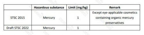 Supprime les provisions sur le mercure. Une fois que le STSC 2022 entrera en vigueur, la valeur limite de mercure dans les cosmétiques du contour des yeux contenant des conservateurs au mercure organique sera inférieure à 1 mg/kg, comme pour les autres cosmétiques.