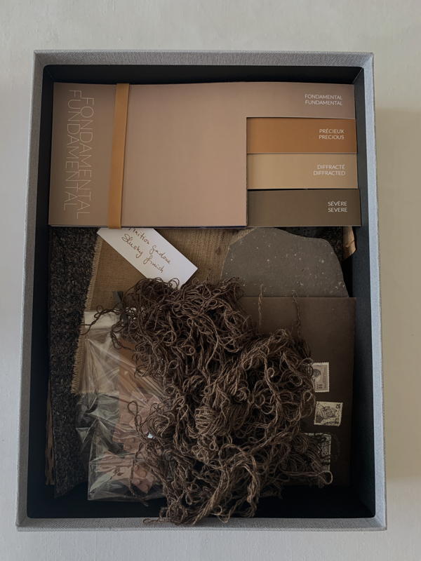 Each box contains a manifesto, an editorial (all texts are bilingual French + English), and a colour chart. Each shade is associated with images and keywords and all the choices are substantiated and contextualised with meaningful images, artistic references, literary words, technical notes or historical accounts which also allow to broaden the scope or, on the contrary, to go into details. All of this is combined with a variety of materials (tinted mouldings, textiles, leather, plastics, ceramics, glass, etc.) which can be vintage or made to order.