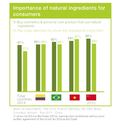 In 2014, 87% of consumers surveyed say they buy cosmetic products that use natural ingredients. In Brazil this number is 96%, in the UK 72%. Consumers are increasingly looking for transparency: 77% say they pay attention to where ingredients in cosmetics products come from. In Brazil, Colombia and Vietnam almost 90% of consumers say they pay attention to the origin.