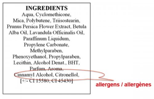 In order to protect the secret of their composition, the fragrances used in cosmetics are exempted from the full labelling of their ingredients. With the exception of substances identified as potential allergens, all the ingredients in a perfume composition are therefore gathered under the terms "parfum" or "aroma". To date, the list of substances identified as potential allergens includes 26 entries (including, Limonene, Eugenol, Cinnamal, Benzyl Benzoate, etc.). These 26 fragrance ingredients must be labelled so as patients who know the cause of their allergy are able to avoid cosmetics that will cause reactions.