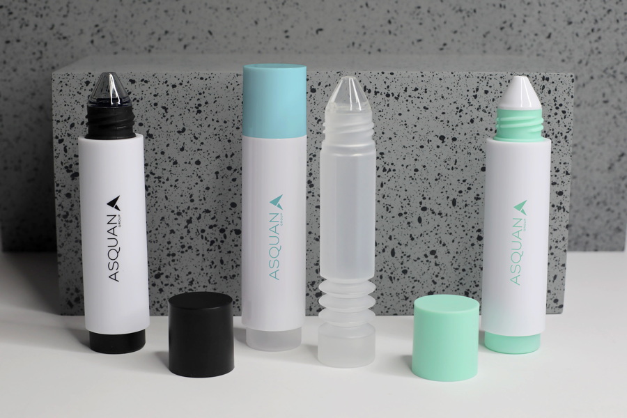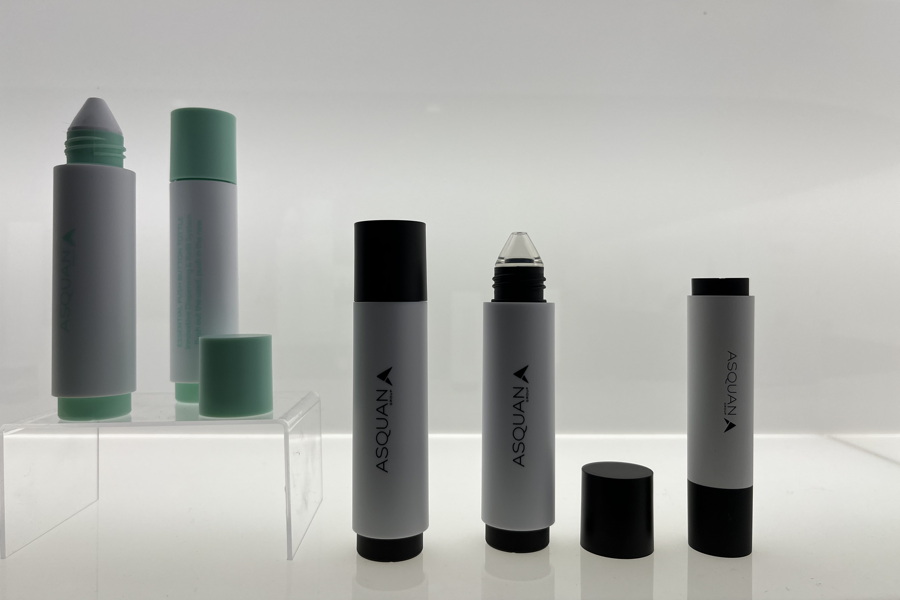 Asquan has showcased the Essential Push Button Tottle, a 30ml refillable unit with an integrated ‘spring’ that dispenses out of the nozzle by depressing the tottle body from the end. There are two available size offerings of nozzle orifice (1.2mm & 2mm) to match a wide variety of formula viscosities. The tottle + nozzle refill unit snaps in and out of the outer housing for an easy and intuitive refill story.
