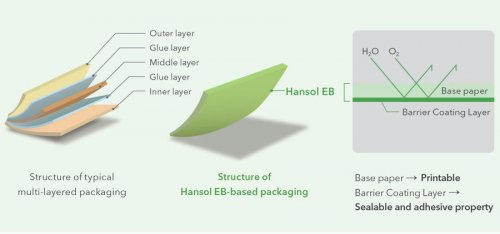 Unlike other types of packaging that are designed to block oxygen, moisture, etc., by bonding two to three layers of plastic film or aluminum foil together, Hansol EB is made with a single layer of base paper that is fully coated with a barrier and thus is highly advanced in terms of efficiency with reduced production costs and a shortened production process.