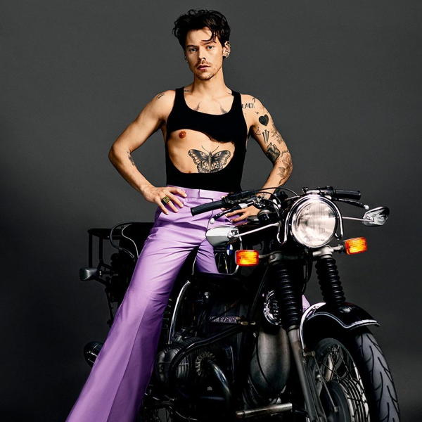 Le chanteur a d’ailleurs une fois encore fait sensation en couverture de DAZED, il y a quelques jours, posant en pantalon évasé parme et top cut out, façon exagérée, sur une moto, puis dans le contenu du dossier qui lui a été réservé, en robe pull verte et collants à pois, combinaison semi-transparente, ou encore manteau matelassé oversize. Un shooting qui confirme sa volonté de n’avoir que faire des stéréotypes et diktats qui, depuis des mois, semblent plier sous le poids d’une génération plus libre que jamais. « C’est drôle parce que je ne me vois pas comme une icône de style… mais rassembler les gens est la chose dont je suis le plus fier », a confié Harry Styles au magazine de mode. À bon entendeur !