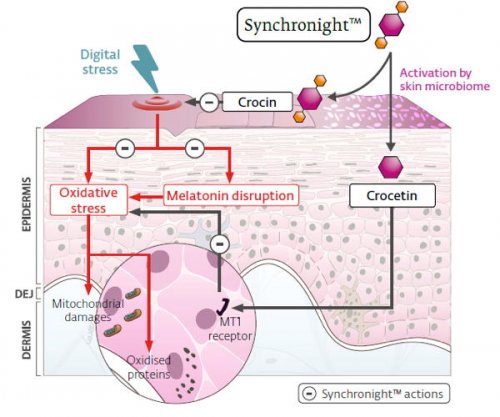 Synchronight protects the cutaneous production of melatonin when skin is exposed to a digital stress thanks to its blue light absorbing properties. Melatonin can therefore achieve its natural role of fighting against the deleterious effects of digital pollution on premature skin ageing. But moreover, thanks to its activation by the skin microbiome into a vegetal melatonin-like molecule, it synergistically takes an active part into skin defences and well-being mechanisms.