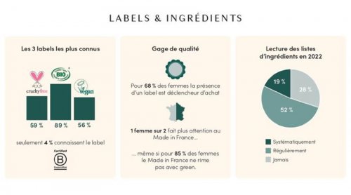 Dans ce contexte, selon Blissim, la présence d’un label est déclencheur d’achat pour 68% des femmes. Les plus connus par les Françaises sont « Cosmétiques Bio », « Cruelty Free » et « Vegan » à 89%, 59% et 56% respectivement.