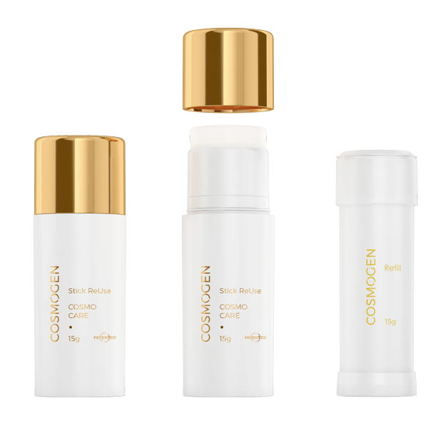 Tubes, airless bottles and sticks dedicated to solid formulas, Cosmogen has put forward all the possibilities of use and application in a refillable version with the ReUse range and its different independent applicators.