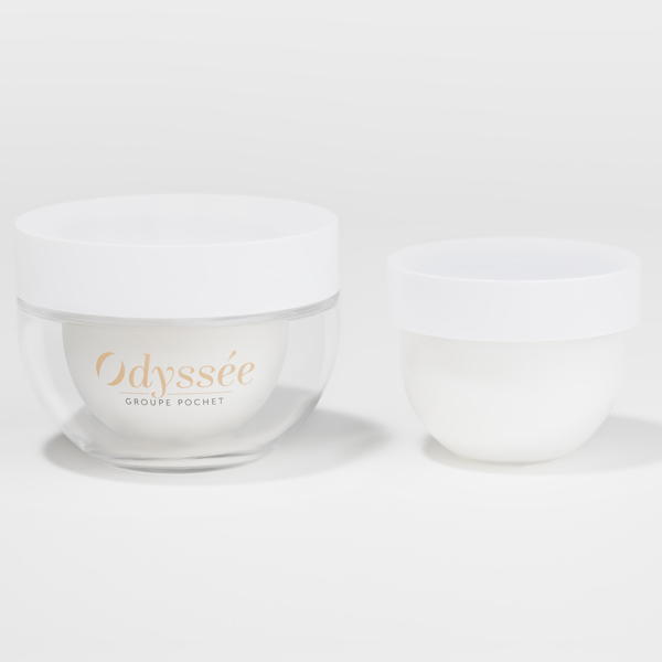 The same approach is taken by the Pochet Group, which promotes "Luxury in a different way" with the Odyssée jar, a 2-in-1 jar that combines a case and a lightweight glass refill. The refill can be closed with its recycled plastic cap and change into a product on the go.