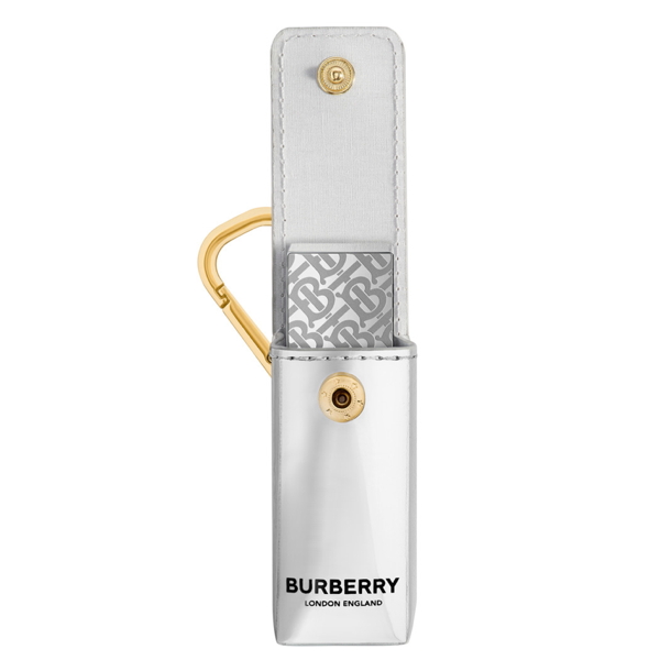 The lipstick case, made of silver mirror material is designed for mobility thanks to its metal snap hook. The logo has been screen-printed in black and the gold-coloured snap button also bears the brand name.