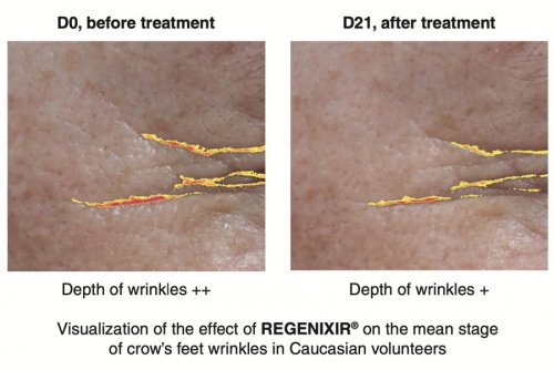 In clinical tests, an emulsion with Regenixir at 2.5% demonstrated an anti-wrinkle effect as of 21 days of application, by significantly reducing crow’s feet wrinkles in Caucasian (-10%) and Asian subjects (-6%).